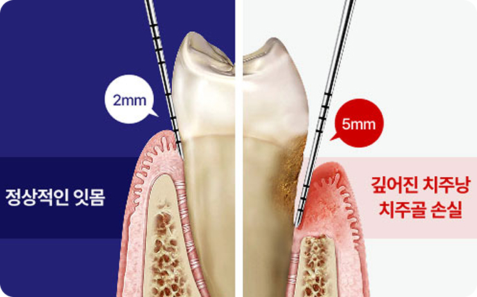 염증으로 인해 부은 잇몸은 치주낭(세균집)을 형성해요.